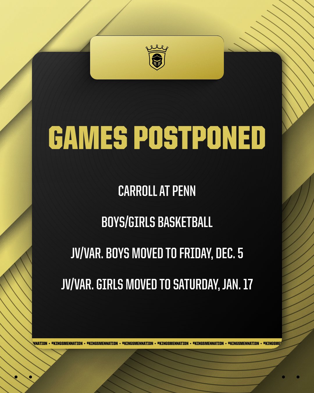 Due to impending weather conditions, the Carroll at Penn Boys and Girls Basketball games scheduled for Saturday, Nov. 29, 2025, have been postponed.